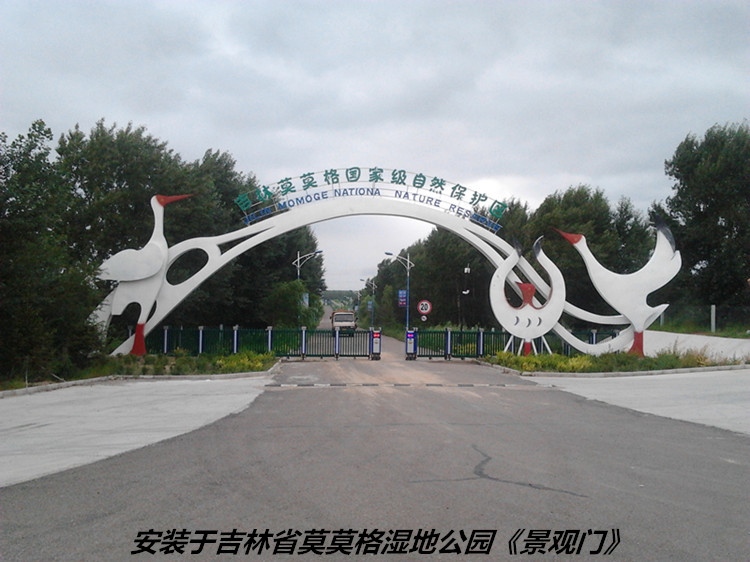 安裝于吉林省白城市莫莫格濕地公園《景觀大門》 材質(zhì)為:內(nèi)鋼材骨架,外為不銹鋼板,表面噴涂氟碳漆。